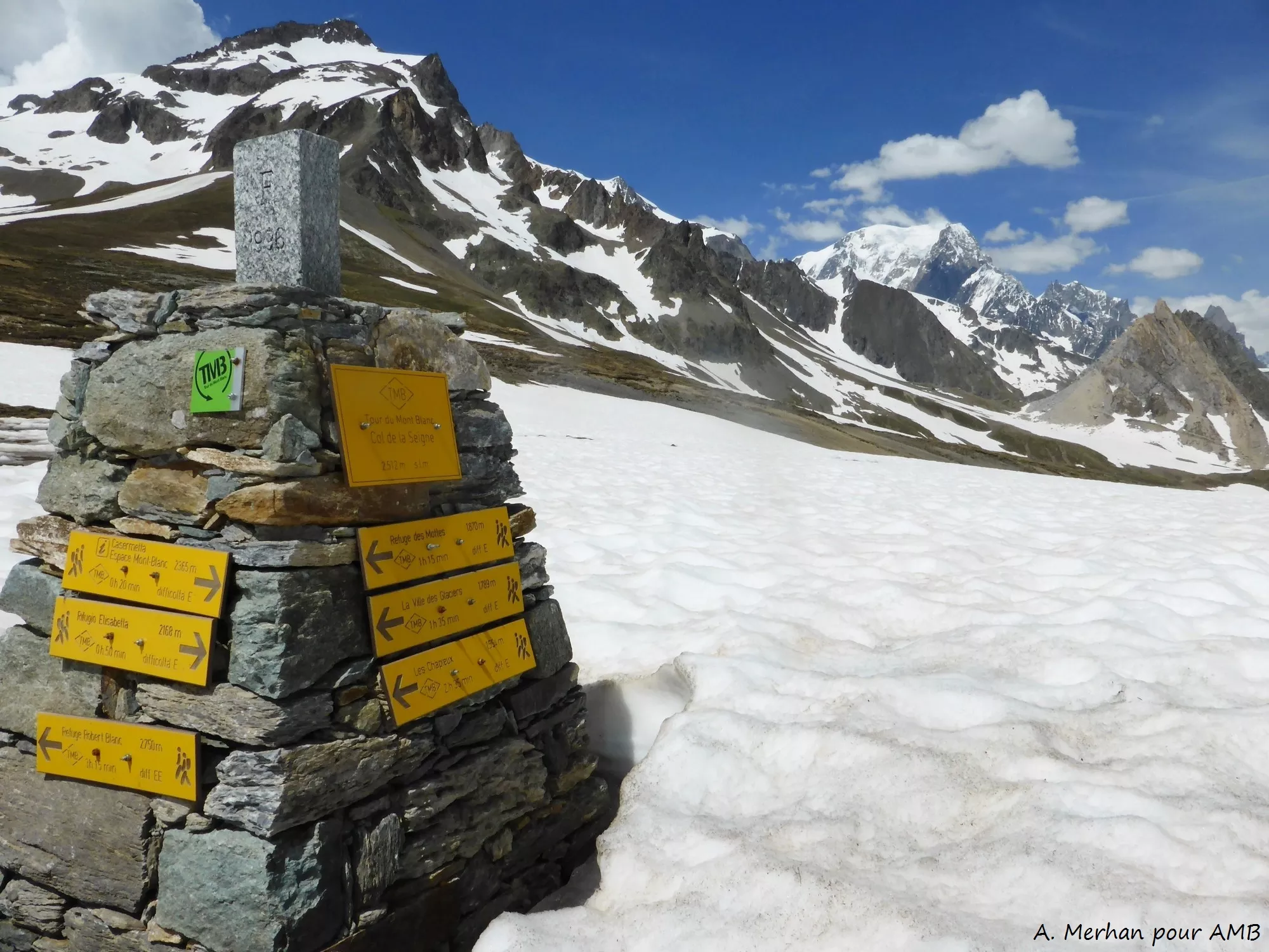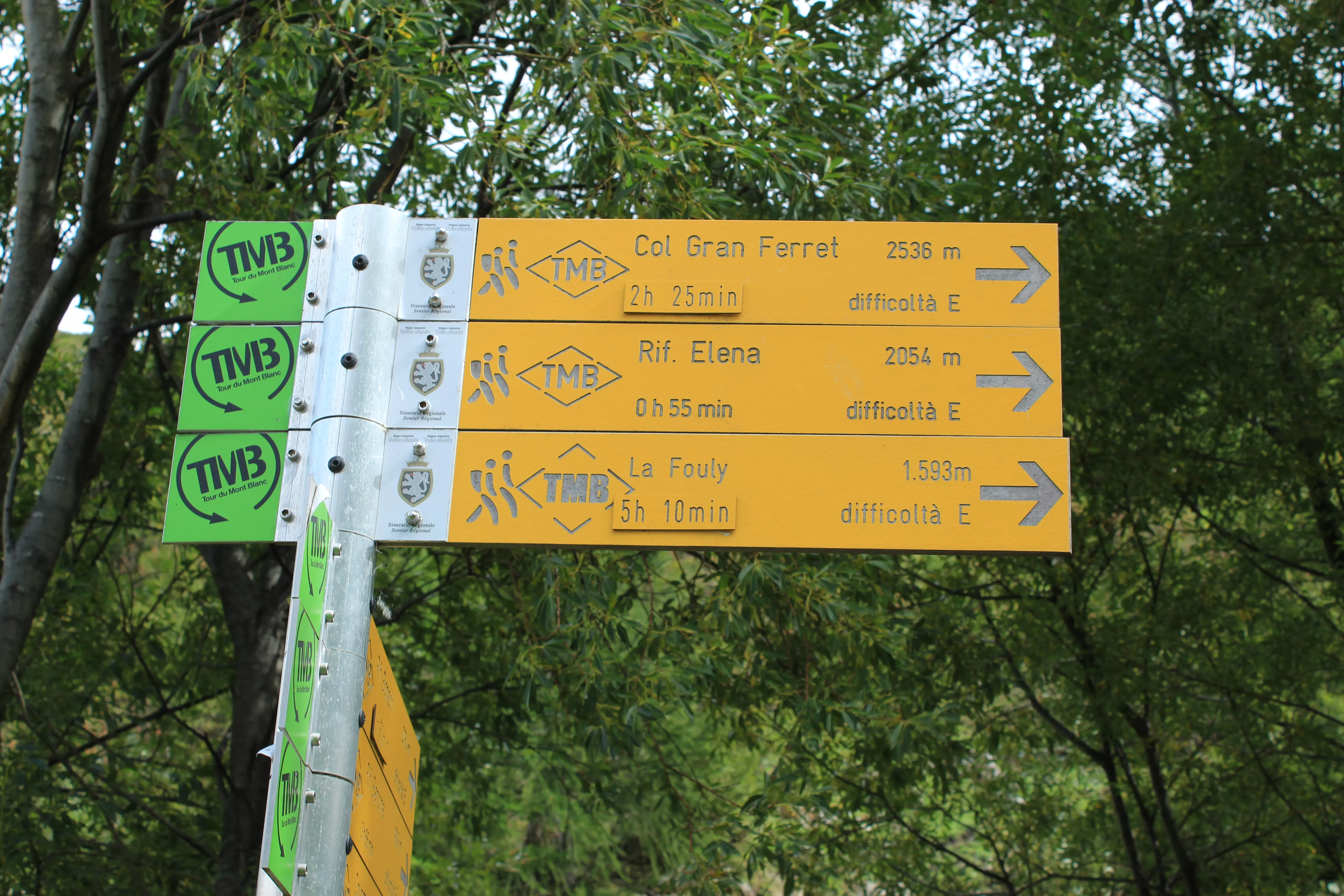 - En Italie, le balisage est indiqué par des marques jaunes (traits, flèches, ronds, triangles, losange avec l’inscription « TMB »