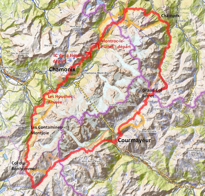 Commençant traditionnellement dans la vallée de Chamonix, ce trek de 7 à 10 jours fait le tour du massif du Mont Blanc, et s'étend sur 400 kilomètres. Au cours d'une boucle de 170 kilomètres et de 10 000 mètres de dénivelés, franchissant plus d'une dizaine de grands cols alpins, le randonneur découvre les contrastes constants des paysages et des cultures.