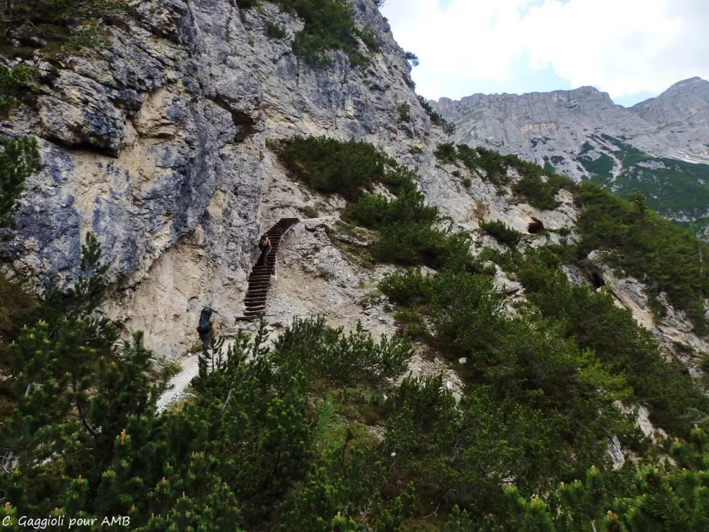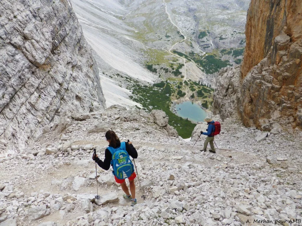 Après la face Nord des Tre Cime, très belle descente dans la vallée di Landro. Suit une montée assez raide, avec une traversée un peu aérienne bien sécurisée par une rampe en câble (50 m), qui contourne le Strudelkopf. Passage au col Specie et descente sur le magnifique alpage de Prato Piazza. Montée possible également par le Val Specie. Nuit en refuge sur le plateau.