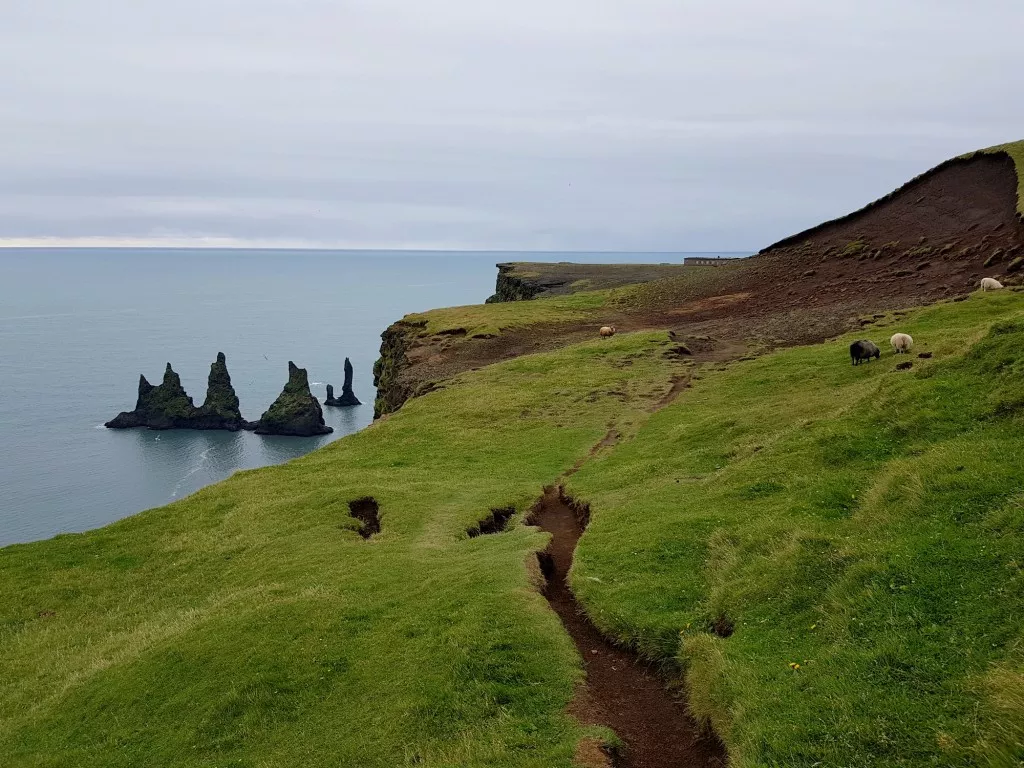 Les grandes prairies côtières paraissent désertes à première vue, mais c’est là que vit le fabuleux cheptel Islandais, moutons et chevaux islandais (plus nombreux que les habitants de l’île !).