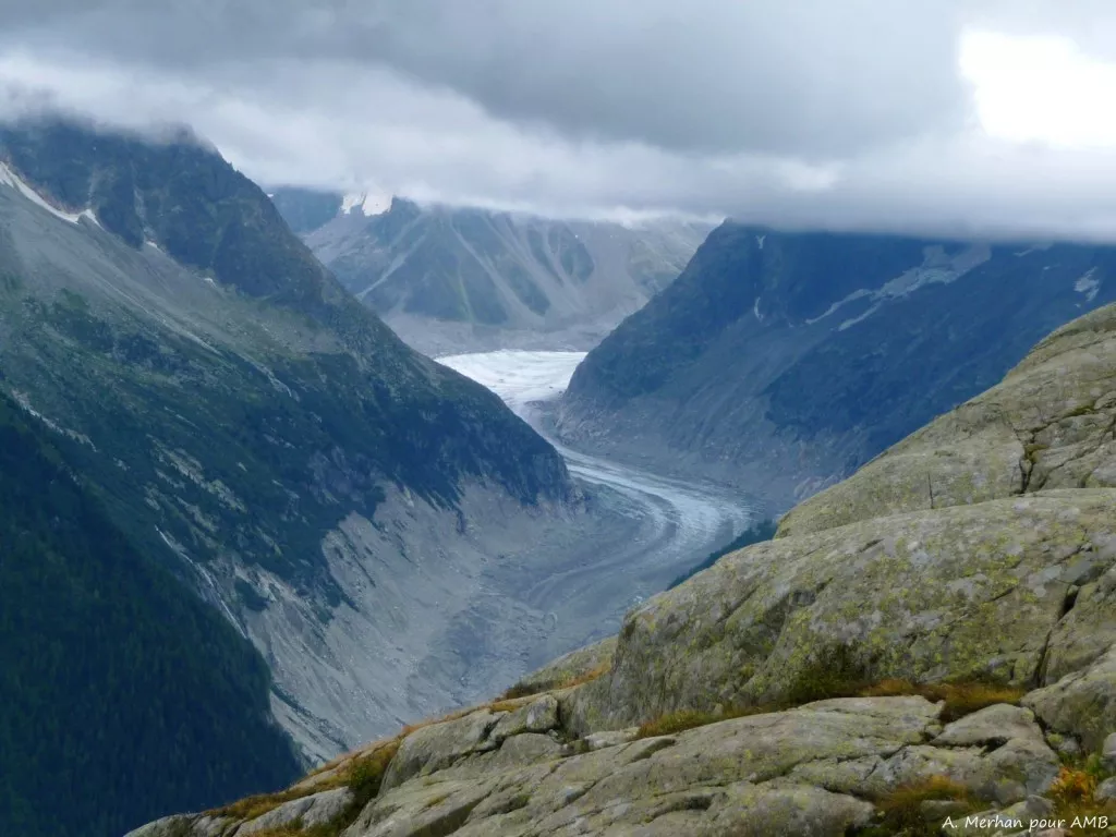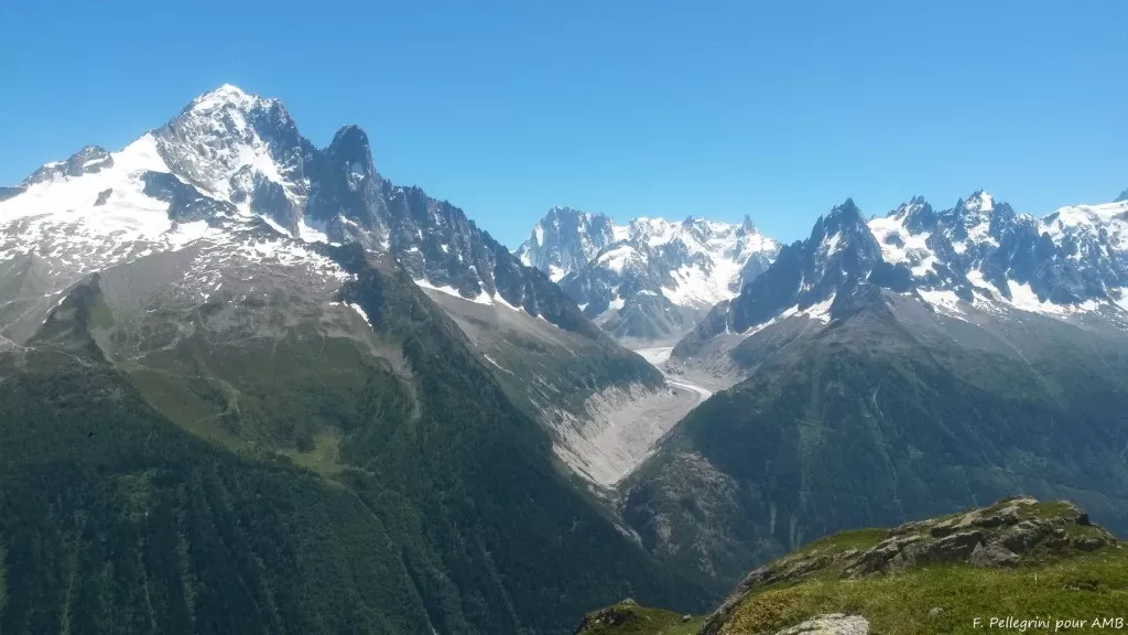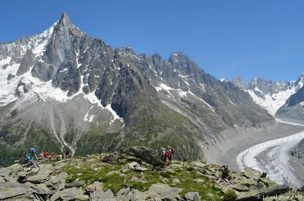Montée par le téléphérique de l’Aiguille du Midi jusqu’au Plan de l’Aiguille et randonnée en balcon par les alpages de la Blaitière jusqu'au signal Forbes (2200 m). Descente longeant la Mer de glace face à l’Aiguille des Drus et aux Grandes Jorasses. Descente ensuite à Chamonix à pied ou par le petit train de la mer de Glace. Nuit à Chamonix.