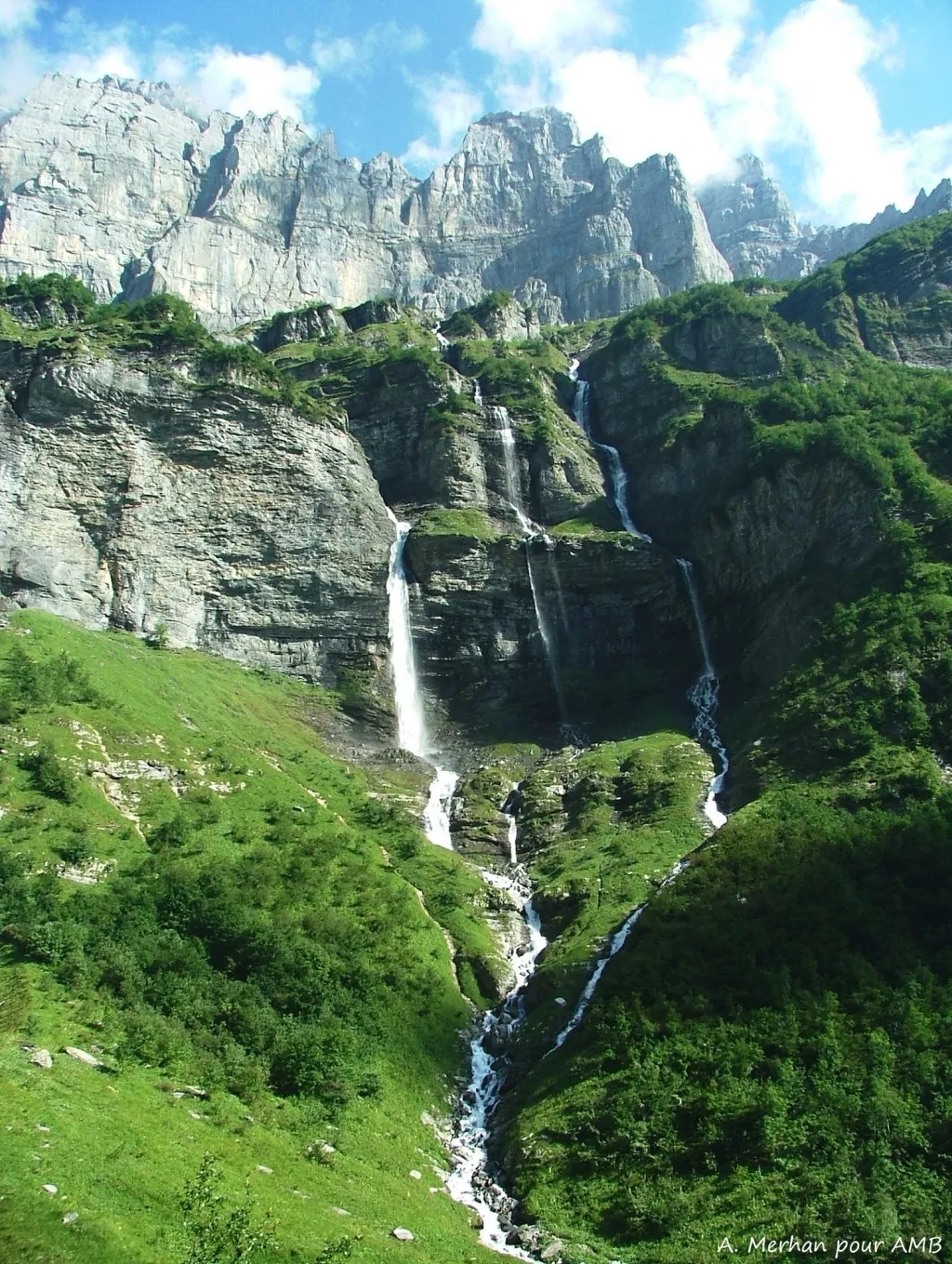 Depuis le refuge de la Vogealle, une très belle descente face aux falaises du Tenneverge nous conduit au Bout du Monde puis au cirque du Fer à Cheval, et leurs multiples cascades. Nuit au village de Sixt-Fer-à-Cheval.