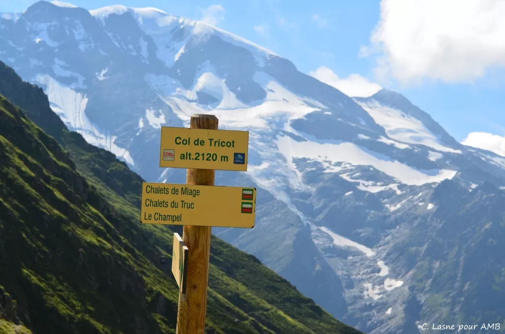 Montée avec la télécabine de Bellevue puis cheminement entre vallons et forêt avant l'ascension du col du Tricot, face au glacier de Bionnassay. Après une pause-café aux chalets du Miage, descente au village des Contamines Montjoie, puis Notre Dame de la Gorge.