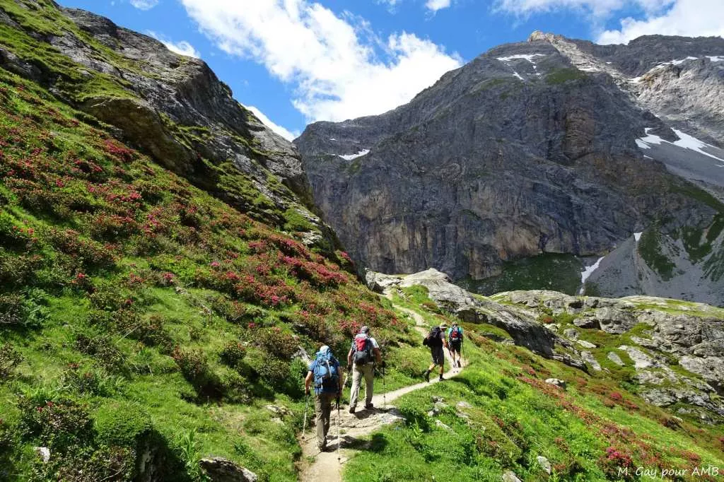Après avoir quitté le refuge, traversée par des sentiers en balcon dominant le vallon de Pralognan : Combe de l'Arcelin, Cirque du dard, du Grand Marchet et du Petit Marchet, lac de la Valette, Combe des Nants. Descente au vallon des Prioux (variante plus facile possible par Pralognan).