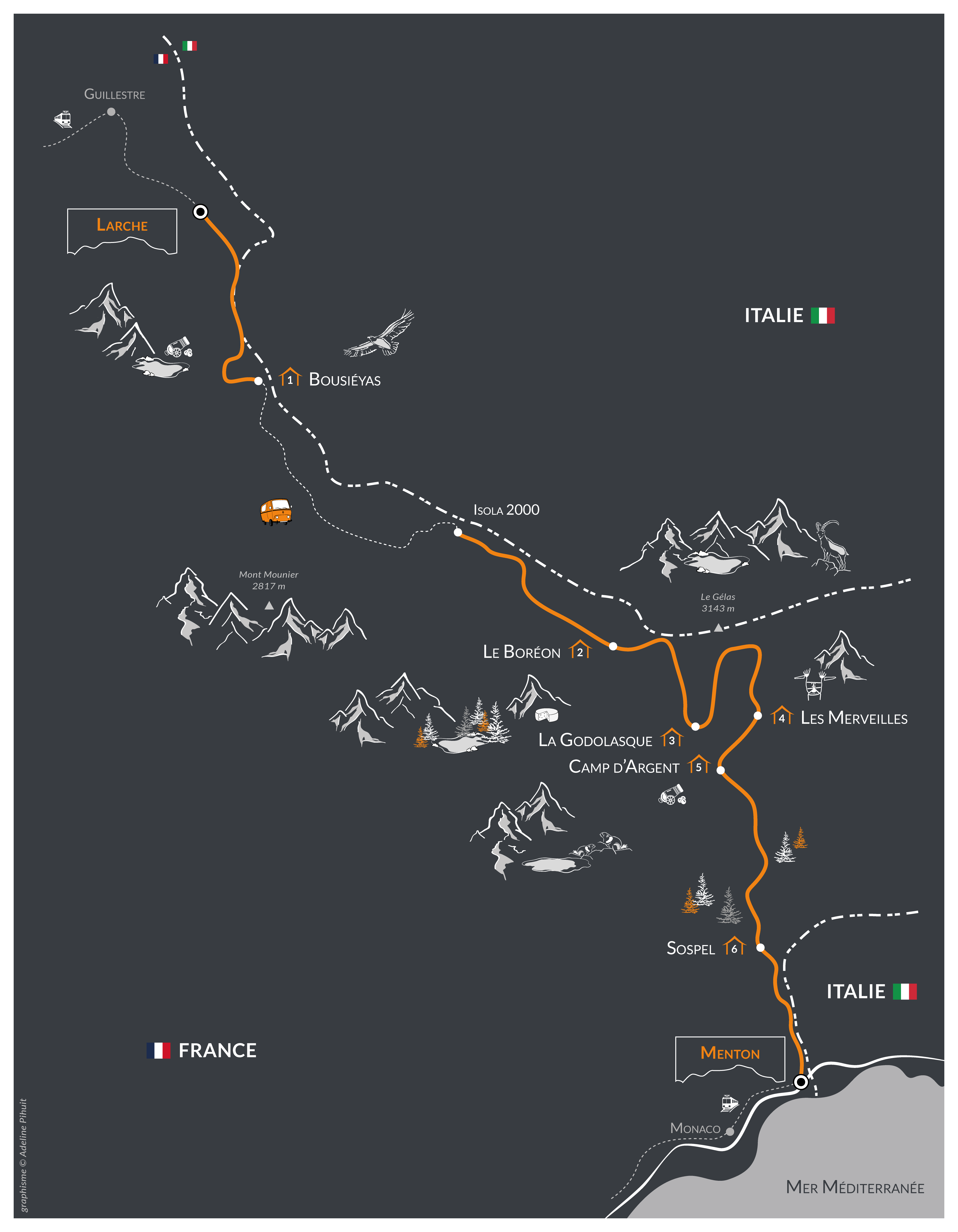 Au départ de Boréon, montée en direction du lac de Trécolpas pour passer le pas des Lardes (2448 m) dominé par le Gelas, plus haut sommet du Mercantour. Descente vers les hospices de la Madone de Fenestre pour passer à proximité de la fruitière de la vacherie de la Madone. Montée du vallon du Poncet pour rejoindre la Baisse des lacs puis les 5 lacs des Prals avant de remonter jusqu'à la Baisse des Prals. Belle descente jusqu'au fond de la vallée de la Godolasque, au relais des Merveilles.