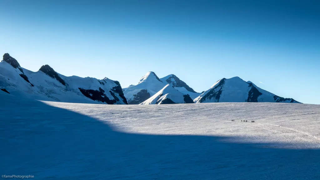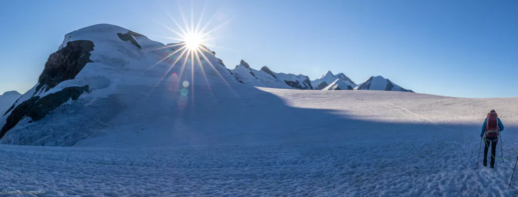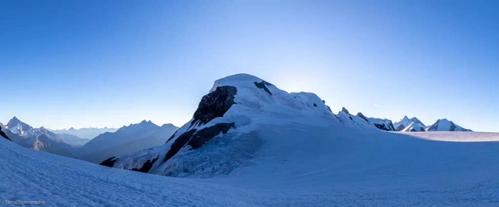 Ascension à travers le glacier jusqu'au sommet du Breithorn à 4164 m. Redescente du glacier du Theodul jusqu’à Trockener-Steg (2939 m) ou traversée au KIein Mattherhorn (3883 m). Descente jusqu’à Zermatt avec le téléphérique. Fin de la randonnée à Zermatt.