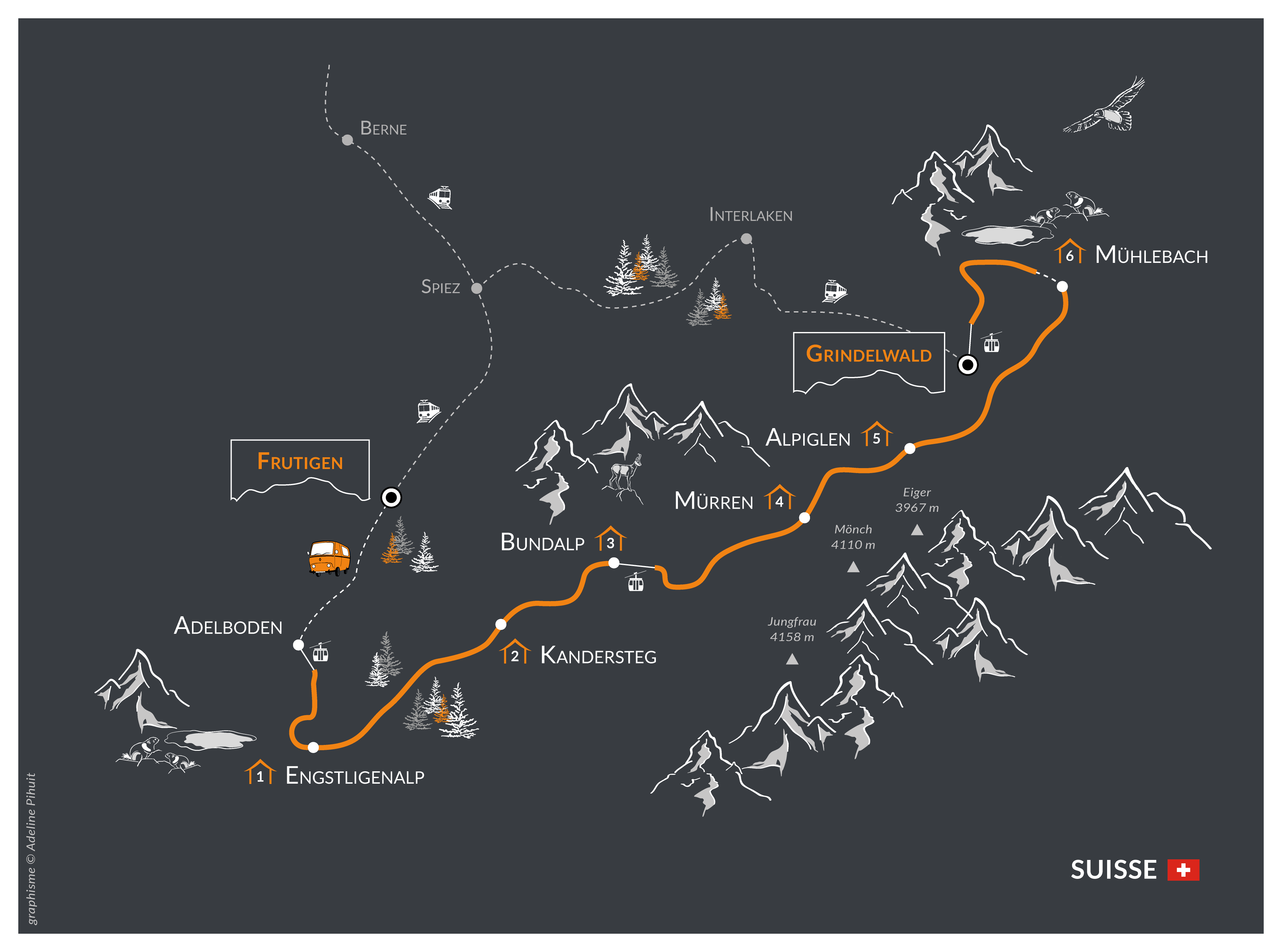 Voici la traversée intégrale d'un des plus prestigieux balcons des Alpes, d’Adelboden à Grindelwald. Une semaine pour admirer les faces extraordinaires du Wetterhorn (3701 m), de l'Eiger (3970 m), du Mönch (4029 m), de la Jungfrau (4158 m) et du Breithorn (3782 m) ! Les sentiers parcourus lors de cette traversée offrent une infinie variété de paysages de montagne - balcons, vallées verdoyantes, villages traditionnels et fleuris, lacs d'altitude.