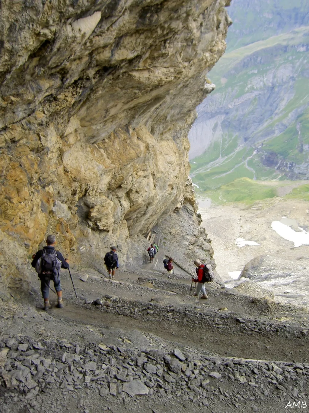 Etape splendide pour cette journée qui démarre dans l’impressionnante vallée de la Gamchi. Les prés laissent progressivement la place à l’ambiance minérale du col de Sefinafurgga (2612m) et l’ascension se termine dans un monde de glaciers et de haute montagne. Panorama extraordinaire sur les sommets emblématiques de la Jungfrau, de l’Eiger et du Mönch qui se dévoilent enfin dans leur totalité et qui accompagnent toute la descente sur Gimmelwald, très beau vieux village d'alpage. Nuit en gîte à Mürren, sans les bagages.