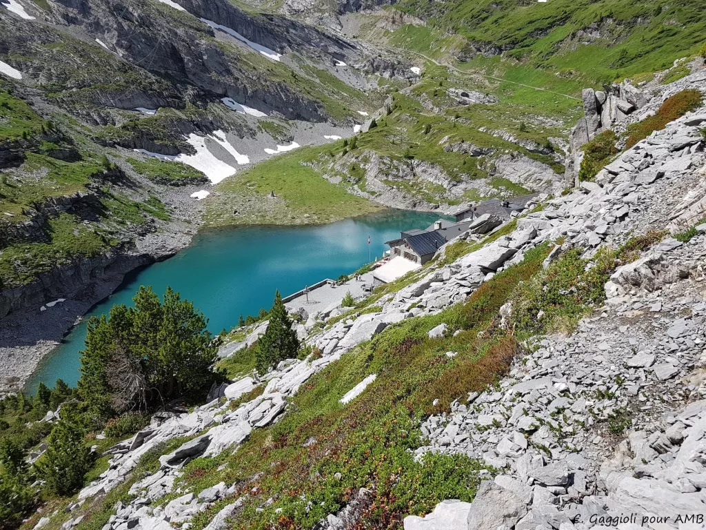 La randonnée démarre dans le fond de la vallée d'Adelboden par un incroyable sentier qui se faufile à travers falaises et cascades pour rejoindre l’alpage d’Engstligenalp, un immense pâturage d'altitude. L'itinéraire monte ensuite au col Chindbetti (2623m) dans un décor lunaire de haute montagne avant de descendre sur le lac glaciaire Tällisee. Une dernière traversée termine la journée en beauté au Berghotel Schwarenbach, étape historique entre Oberland et Valais. Nuit au refuge en dortoir, sans les bagages.