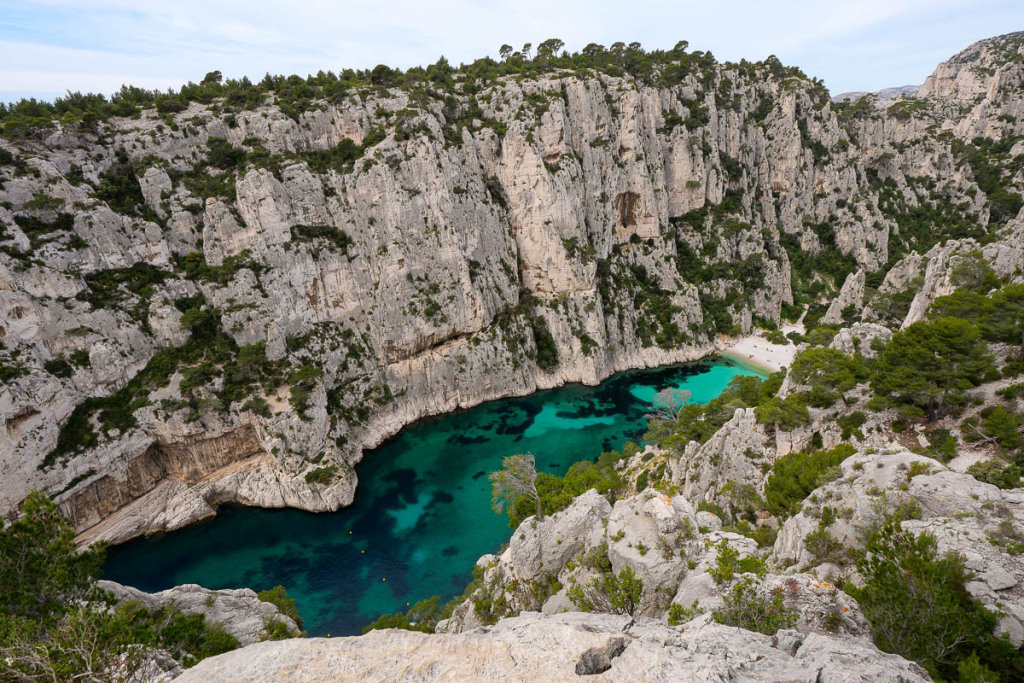 Ce matin, un court transfert conduit au Col de la Gineste, célèbre pour accueillir annuellement le semi-marathon Marseille-Cassis. L’itinéraire commence au pied du Mont Puget, point culminant des Calanques, et suit une crête qui domine le parc national. Le panorama est spectaculaire, révélant la puissance minérale des falaises calcaires et la beauté sauvage du littoral. L’objectif principal est la calanque d’En-Vau, impressionnante par ses parois abruptes et son eau cristalline. Selon le temps, une courte visite de sa plage de galets est possible, sinon, la vue suffit à saisir sa majesté. Le GR longe ensuite le littoral, passant par le gîte de la Fontasse, avant de redescendre sur Cassis.