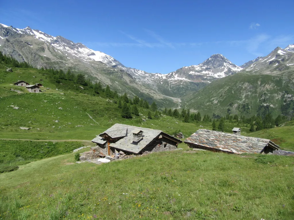 Transfert (1h de route) dans le Val di Rhème. Départ du fond de Val et montée par le Gran Vaudala. On accède à l'alpage Basey par une belle prairie d'altitude. Traversée vers le refuge Bénévolo et descente le long du torrent la Dora di Rhème. En montant directement au refuge Bénévolo, il est possible de faire une superbe rando autour du Truc de San eléna, jusqu'au lac turquoise qui s'échappe du glacier. Ambiance très alpine au pied des contreforts de la Tsanteleina. Descente et installation pour 2 nuits en hôtel, à Bruil.