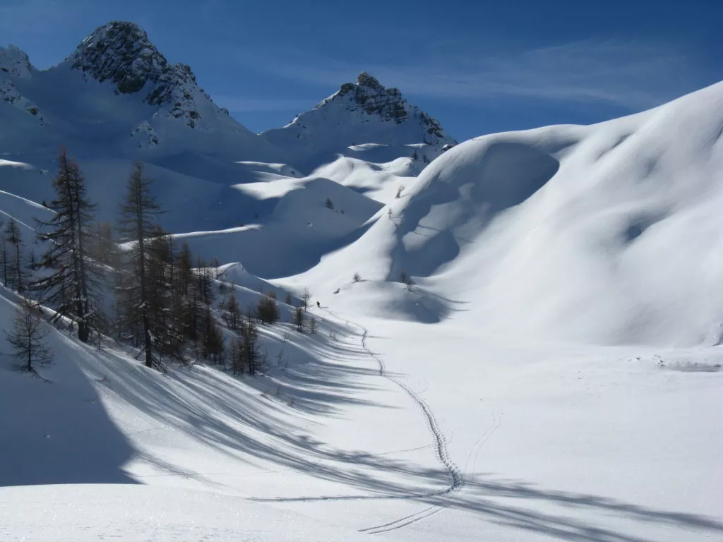 Descente rapide jusqu'au Pont du Moulin, puis par une forêt de mélèzes centenaires, vous rejoindrez la Croix de Curlet qui domine fièrement cette vaste vallée et le village de Saint-Véran. Descente "tout droit" dans la poudreuse jusqu'au Pont du Moulin puis à la Chalp.
