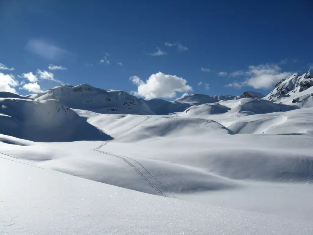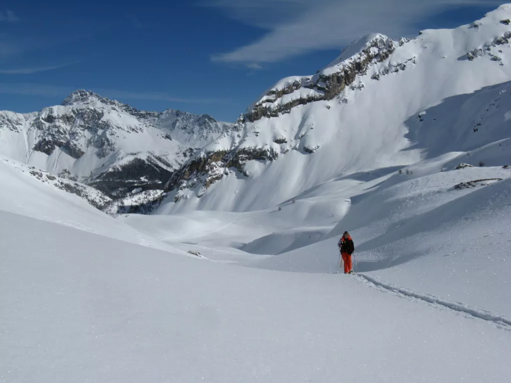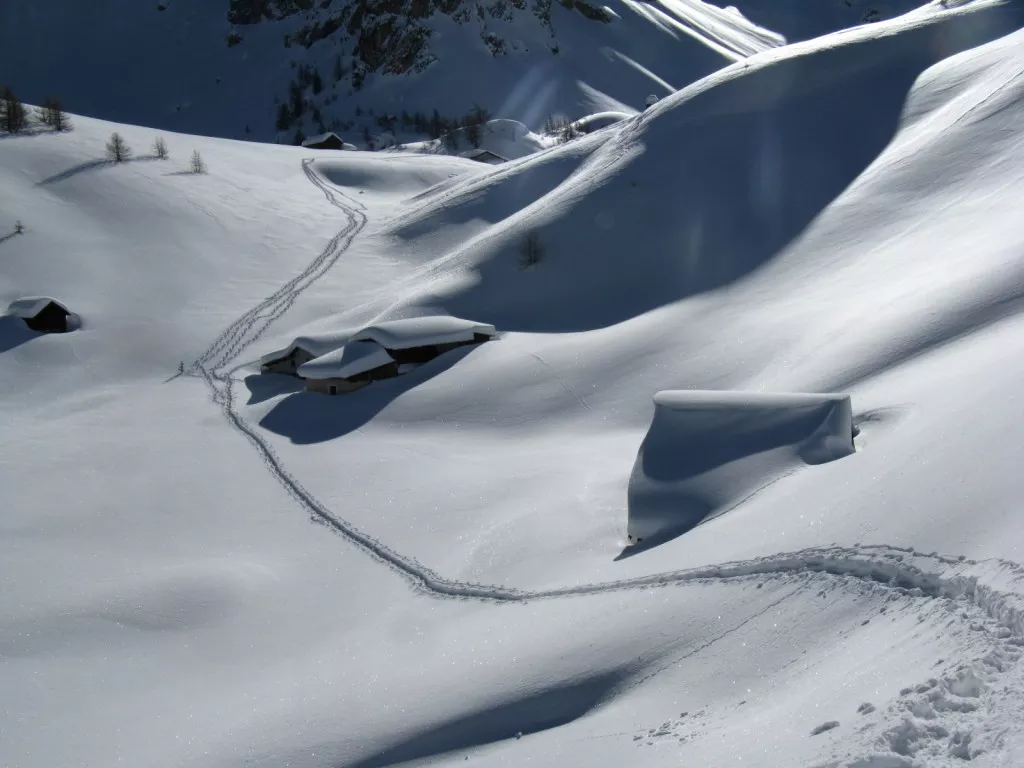 Départ matinal pour cette journée de près de 15km. De Saint-Véran, descendre par la piste jusqu’au pont vieux puis vous remontez le long du torrent de l’Aigue Blanche jusqu’à la Chapelle de Clausis… Grand espaces de blancheur au pied de la crête frontalière. De la chapelle, vous poursuivez par la piste tracée jusqu’au