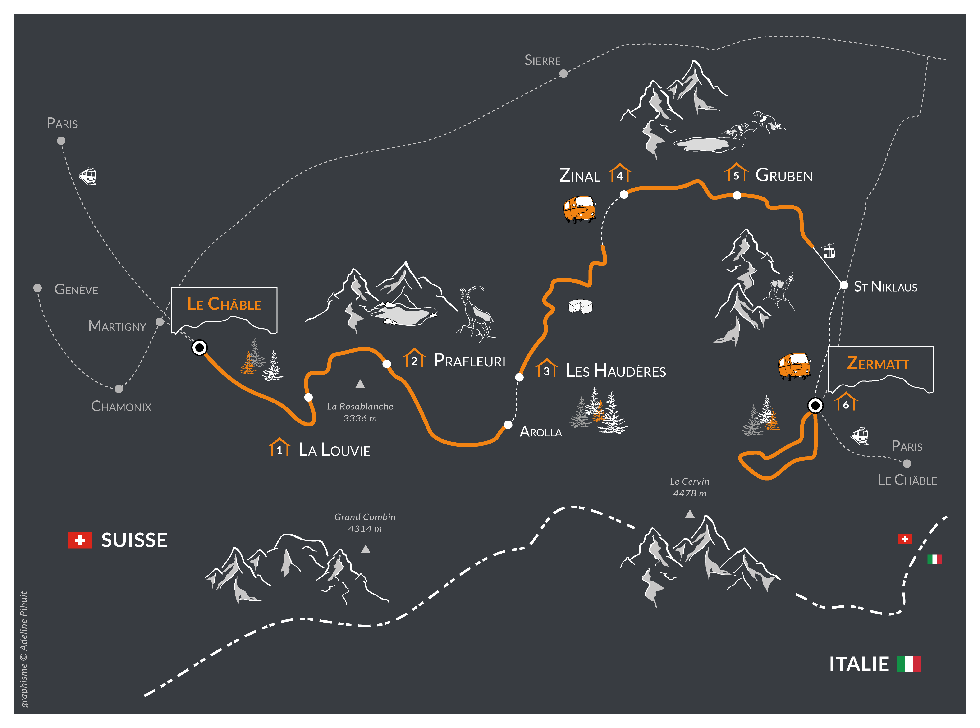 L’itinéraire proposé ici privilégie les paysages suisses. Jusqu’à près de trois mille mètres d’altitude, le sentier nous conduit au pays des "4000", au pied des Mont Blanc de Cheillon, Pigne d’Arolla, le Weisshorn et de leurs glaciers aux allures himalayennes. Ce voyage se termine à Zermatt, au pied du Cervin, haut de 4478m, une pyramide d’une rare élégance, image d’Epinal de la montagne Alpine.