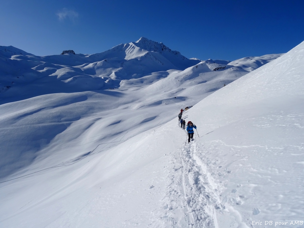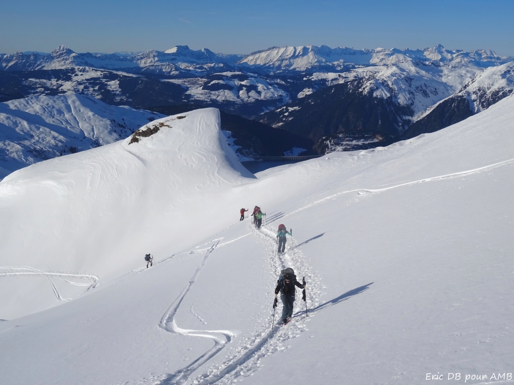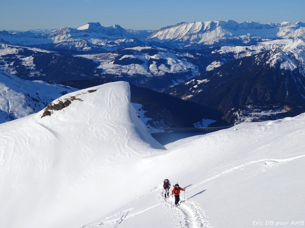 Après une petite montée au-dessus du refuge, le paysage s’ouvre sur des grands champs enneigés avec le massif du Mont-Blanc en panorama. Les alpages d'été ont laissé place à ces étendues qui permettent de traverser tranquillement jusqu’au cormet d’Arêches et le petit refuge de la Coire. Possibilité de faire un détour par un des sommets proches de l’itinéraire. Nuit au refuge, en dortoir.