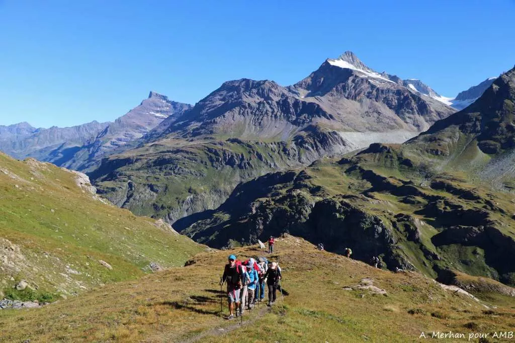 Montée longue mais facile jusqu’au col de Mille à 2470m pour une vue superbe sur le massif du Mont Blanc. Cheminement en balcon du Val d'Entremont au Val de Bagnes et traversée dans les alpages de La Chaux et de La Ly. Nuit au refuge Brunet.