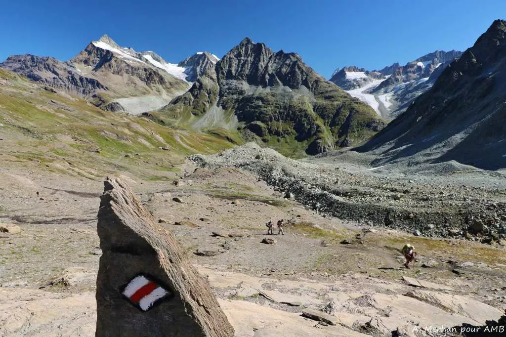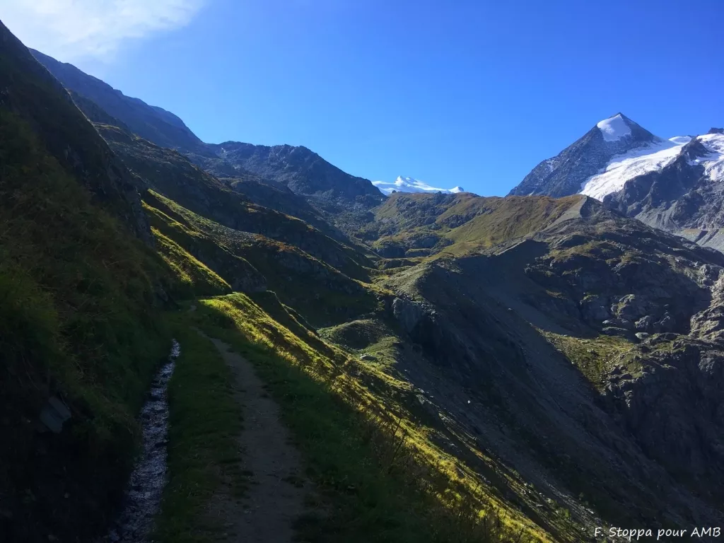 Montée jusqu’au glacier de Corbassière, l’un des plus beaux des Alpes. Coiffé des Combins qui le surplombent, il se dégage ici une ambiance de haute montagne sans précédent. Traversée d'une passerelle impressionante, mais parfaitement sécurisée, au dessus de la moraine. Redescente vers Fionnay le long d'un superbe bisse, petit canal d'irrigation typique du Valais permettant de descendre l'eau des montagnes jusque dans la vallée.