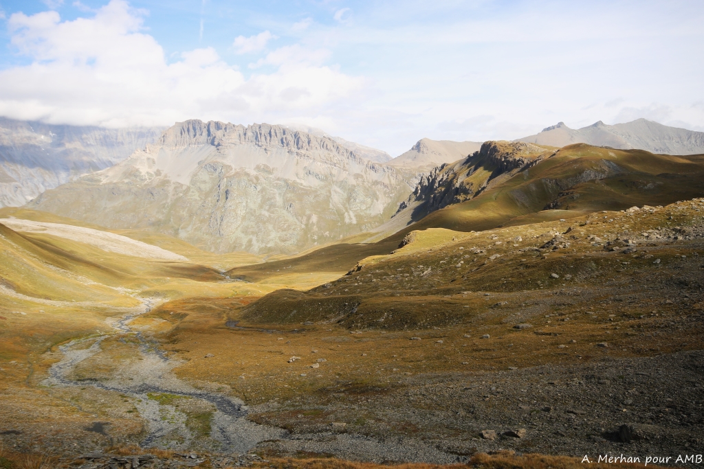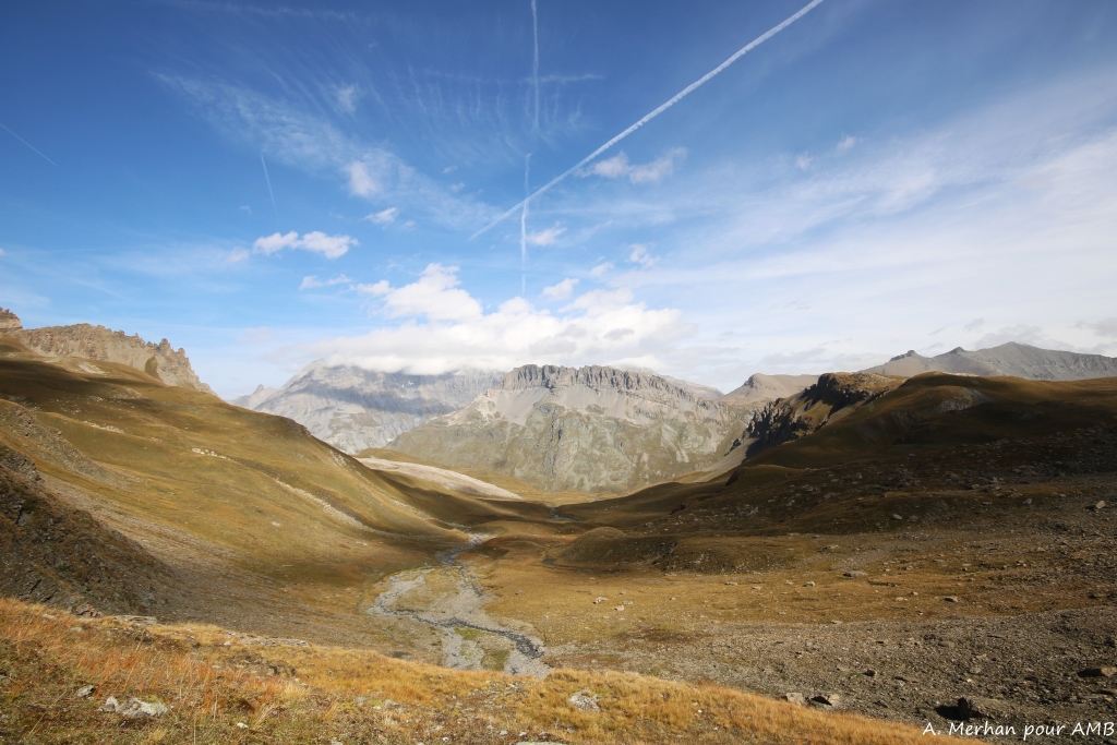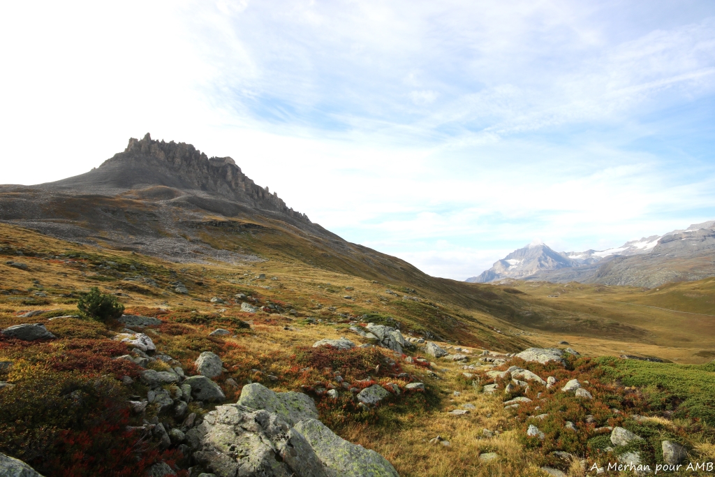 Le parcours se termine avec une grande traversée en balcon qui surplombe la vallée de la Maurienne et le torrent de l’Arc. Le sentier chemine sous les contreforts de la dent Parrachée et le glacier de L’Arpont avant de redescendre sur le village de Termignon.
