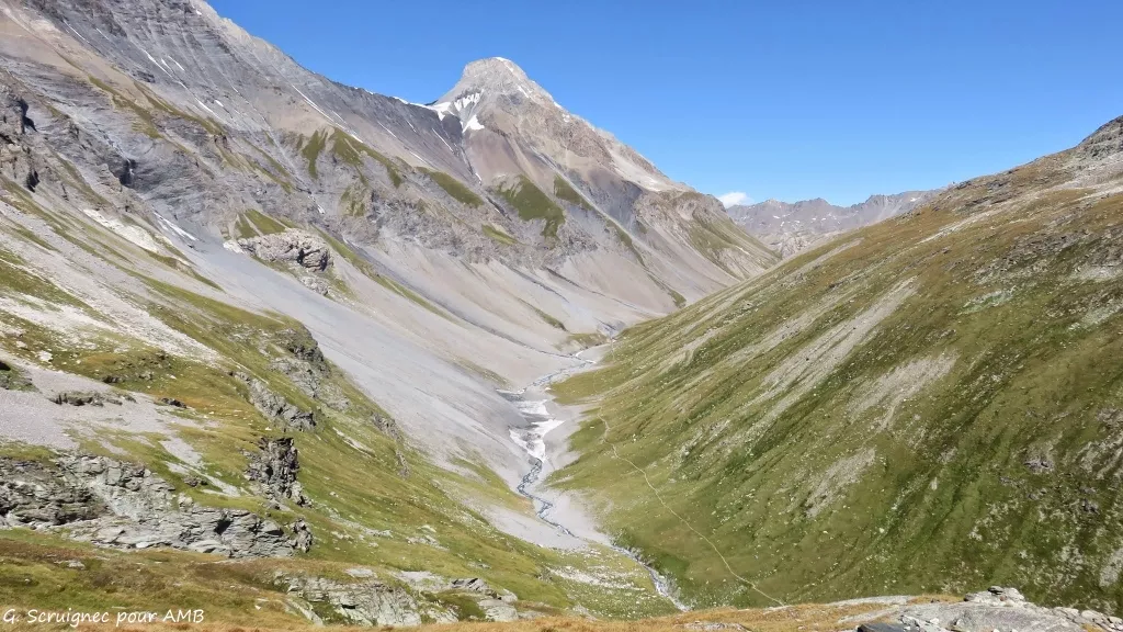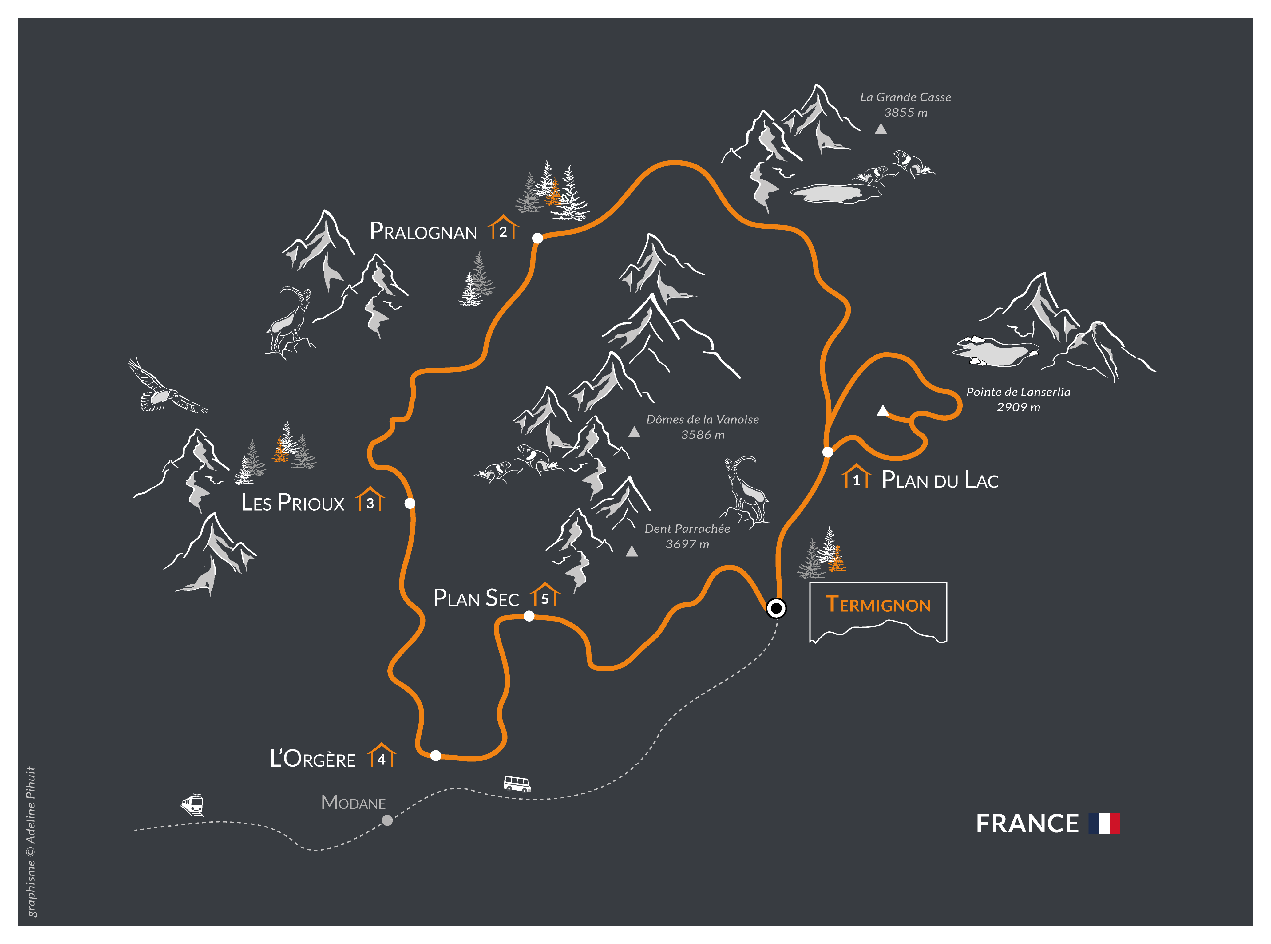 Grande traversée en balcon surplombant la vallée de la Maurienne et le torrent de l’Arc. Le sentier chemine ensuite sous les contreforts de la Dent Parrachée et le glacier de l’Arpont. Descente à Termignon.