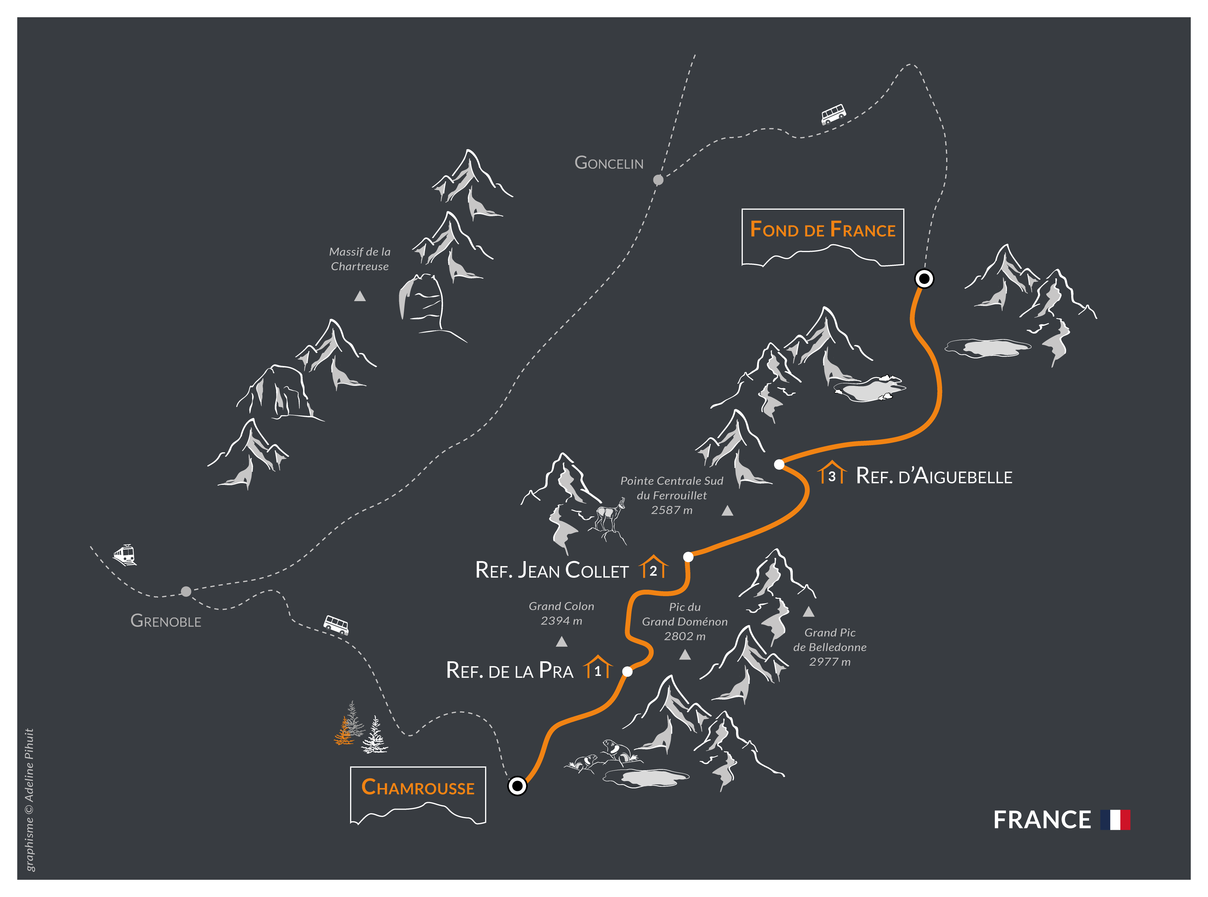 Departure from the Chamrousse ski resort, possible transfer by public bus from Grenoble train station (about 1,5 hours). Each day, one or more alternative routes are proposed to extend the steps.