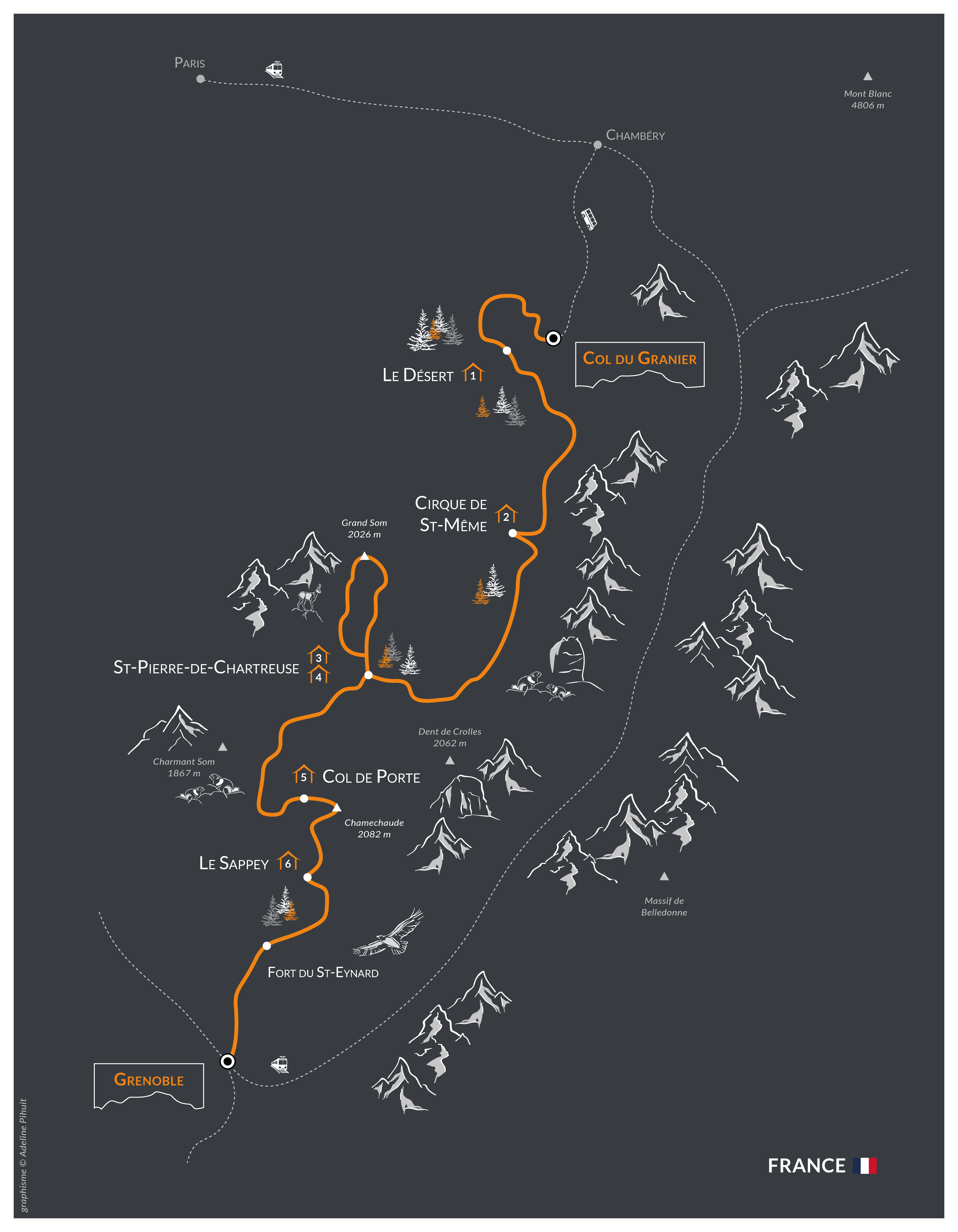 Between two Alpine capitals there is a massif with a wild character that inspired St Bruno to found the Carthusian order. The proposed itinerary allows you to discover all the faces of the massif: plateaus, cliffs, caves, waterfalls, deep forests, monastic life and views of the largest French glacial lake. The ascent of the most beautiful summits offers exceptional views of the valleys and summits of the other Alpine massifs. However, beware, the silence of the monks must not be disturbed in these mountains... The route crosses the massif from Chambéry to Grenoble without taxi transfers, the opportunity for a soft mobility stay and easily accessible by train!