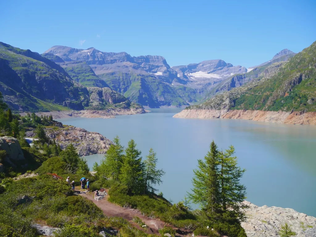 Descend to the Emosson dam. Pass through a tunnel, then alongside the dam and ascend to the Barberine pass (2481m). Descend through the small valley before climbing to the Emaney pass (2462m) with a high-mountain atmosphere under Ruan and Tour Salière (3220m). Descend towards the Salanfe dam nestled between two geological formations. Night in a refuge on the edge of the dam (*without baggage).