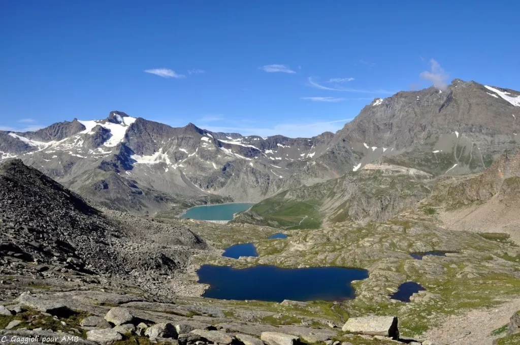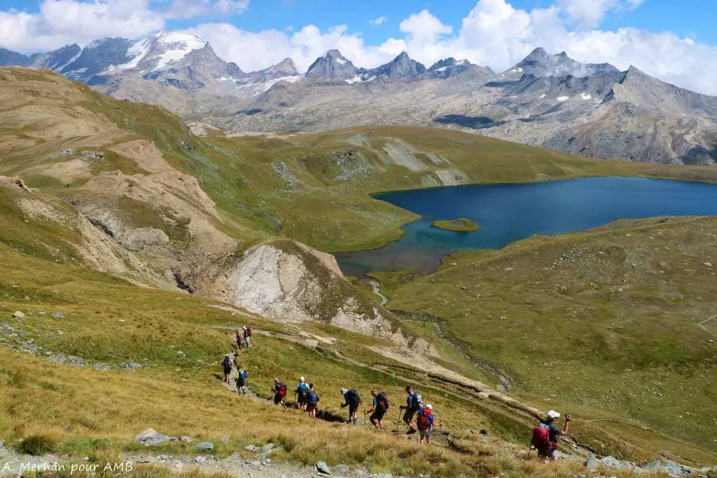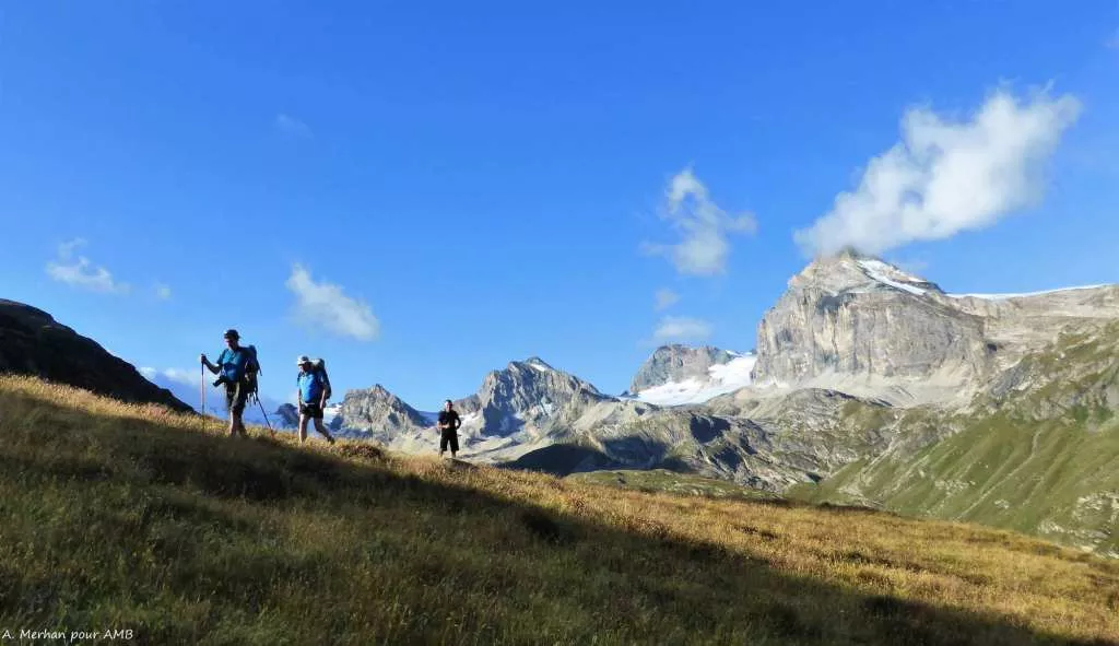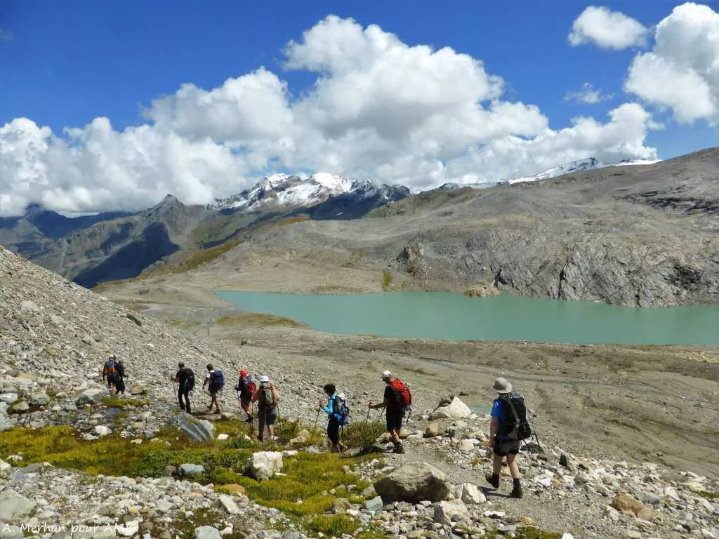 Ascent to the Col de l'Argentière, then crossing the wild plateau of the Lac Blanc to the Col du Rocher Blanc (2833m), border with Italy. Descent in the Valgrisenche valley by the Grapillon lake. Another itinerary passing by the col du Mont (2636m) is possible. Descent to the Bezzi refuge.