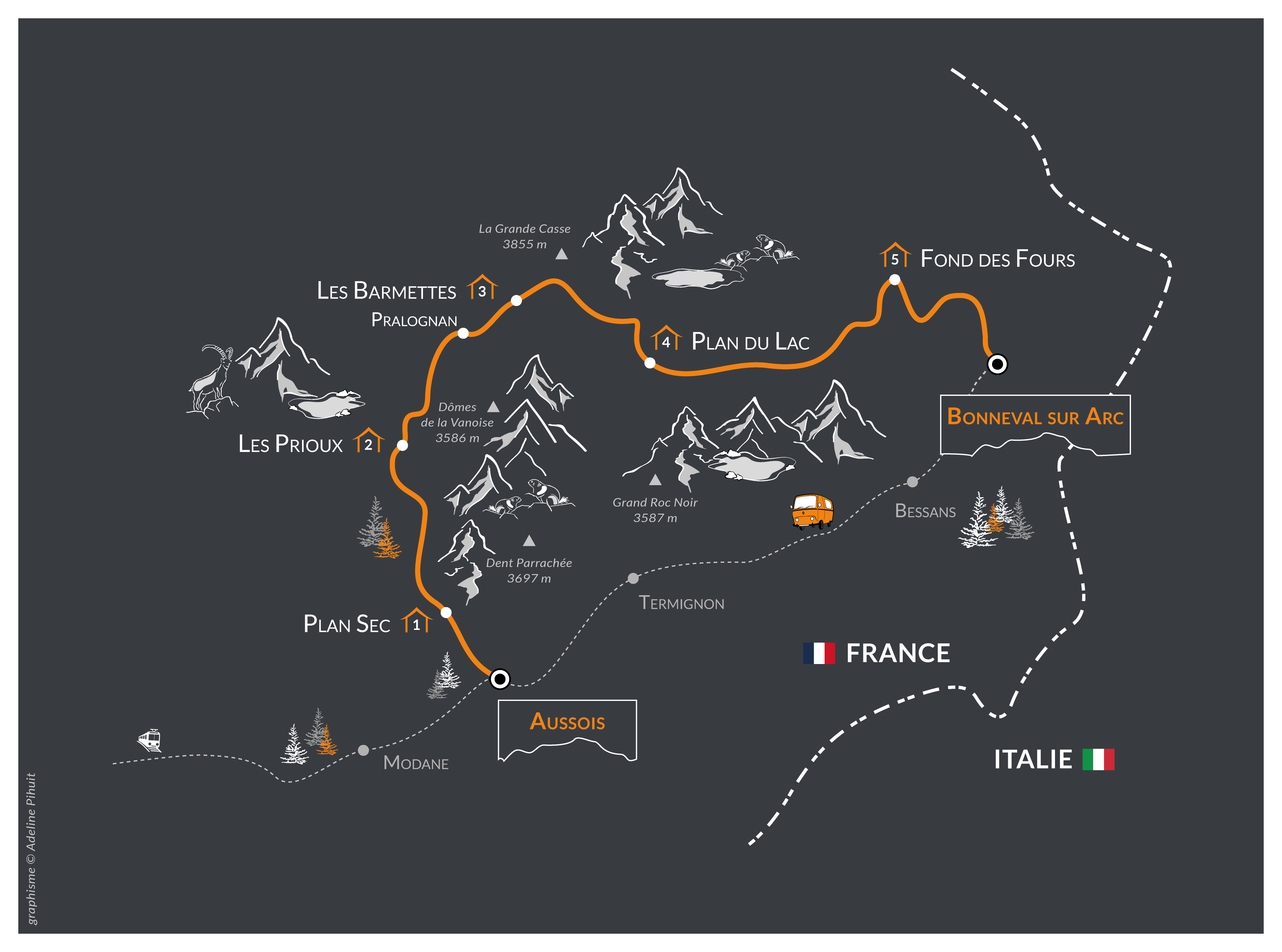 The first of its kind in France, the Vanoise National Park was established in 1963. A vast territory where flora, fauna and a rocky mineral world are all preserved. Between the Maurienne and Tarentaise valleys, its borders meet the Gran Paradiso massif in Italy forming the largest nature reserve in Europe. At the centre of this mountain range lays the icecap of the Domes de la Vanoise, extending over twenty kilometres. This journey, at the heart of the park, takes a route via high mountain passes which connect Aussois, Pralognan and the Haute Maurienne. Trails at high altitude in a fragile mineral world, through vast mountain pastures of the Vanoise where dry-stone buildings punctuate this beautiful route.