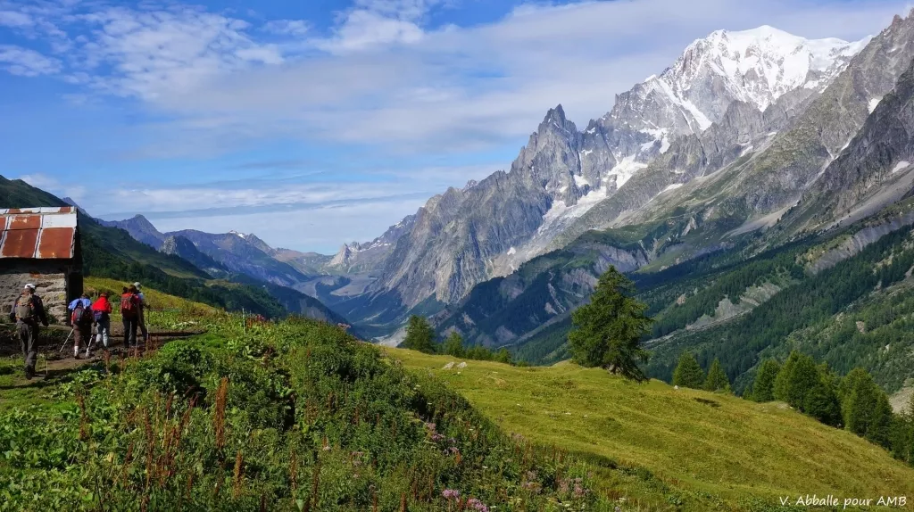 Short transfer to La Vachey in the Val Ferret. After a gentle ascent to the Mont de la Saxe pastures, a long balcony traverse brings us back to Courmayeur... a full day with an exceptional panorama over the south face of the Mont Blanc range.