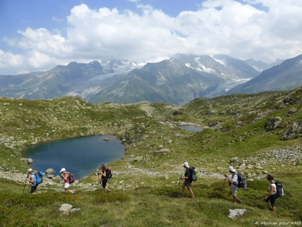 Ascend in the Flégère gondola to the Balcons du Mont Blanc to reach the Lac Blanc at 2300m. Descend via the Col des Montets and the visitors' centre of the Aiguilles Rouges, then to Montroc and the village Le Tour. Night in a gîte.