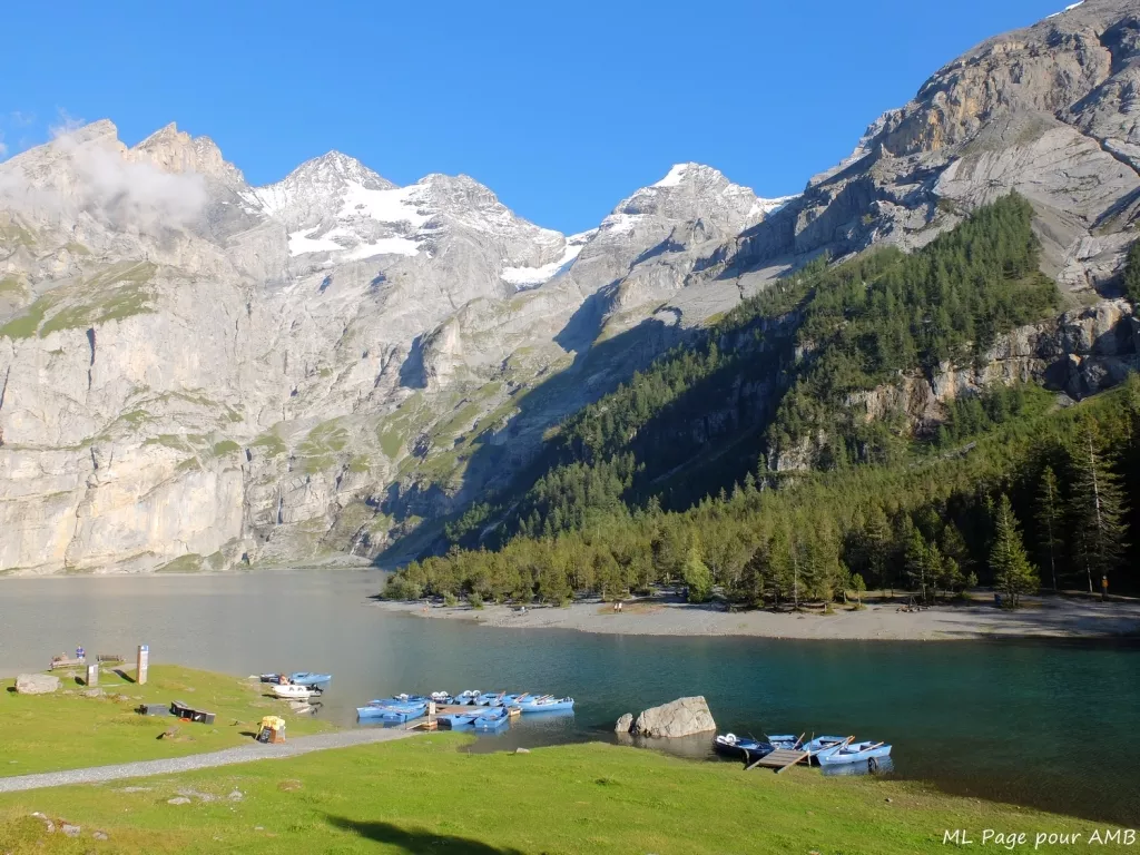 A day around the spectacular Oeschinensee lake, one of the jewels of the Alps, deep blue and nestled in a setting of breathtaking cliffs! After taking the cable car up to the lake, the route takes in a loop facing Bluemisalphorn mountain range and can end with a trip in a rowing boat ! Return to Kandersteg for the night.