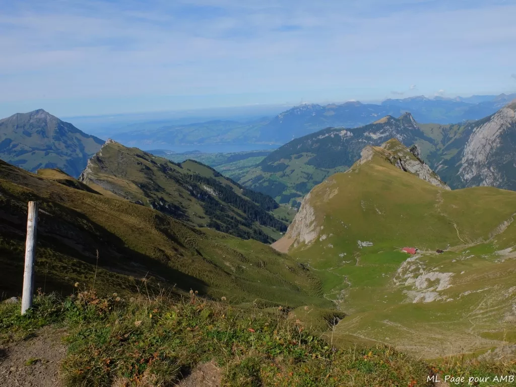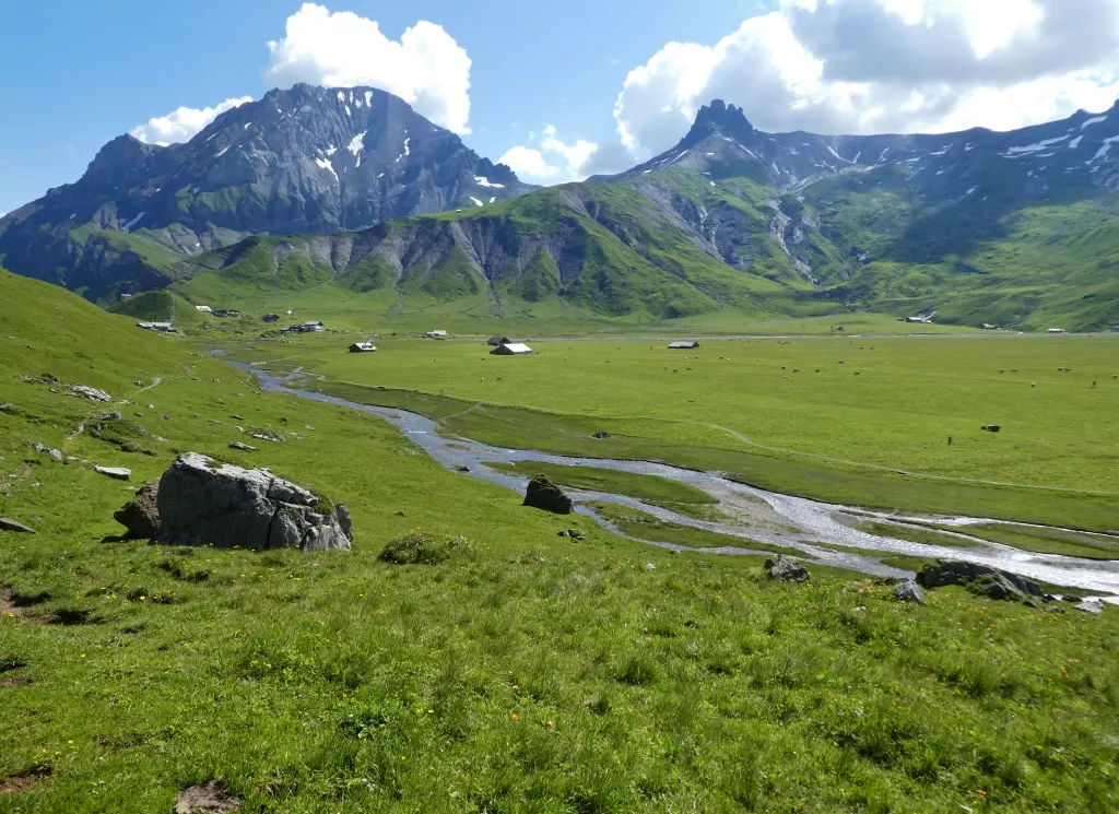From Mittholz, the hike starts through meadows and forest to the Alp de Giesene. The steep climb is largely rewarded by the arrival in the large circus that opens at the foot of the “hore” … Zallers, Salz, Sattel…: fantastic rock faces and vast pastures! After passing the col, the landscape opens wide on the Kiental and Lake Thun. Overnight in Ramslauenen in a gîte.
