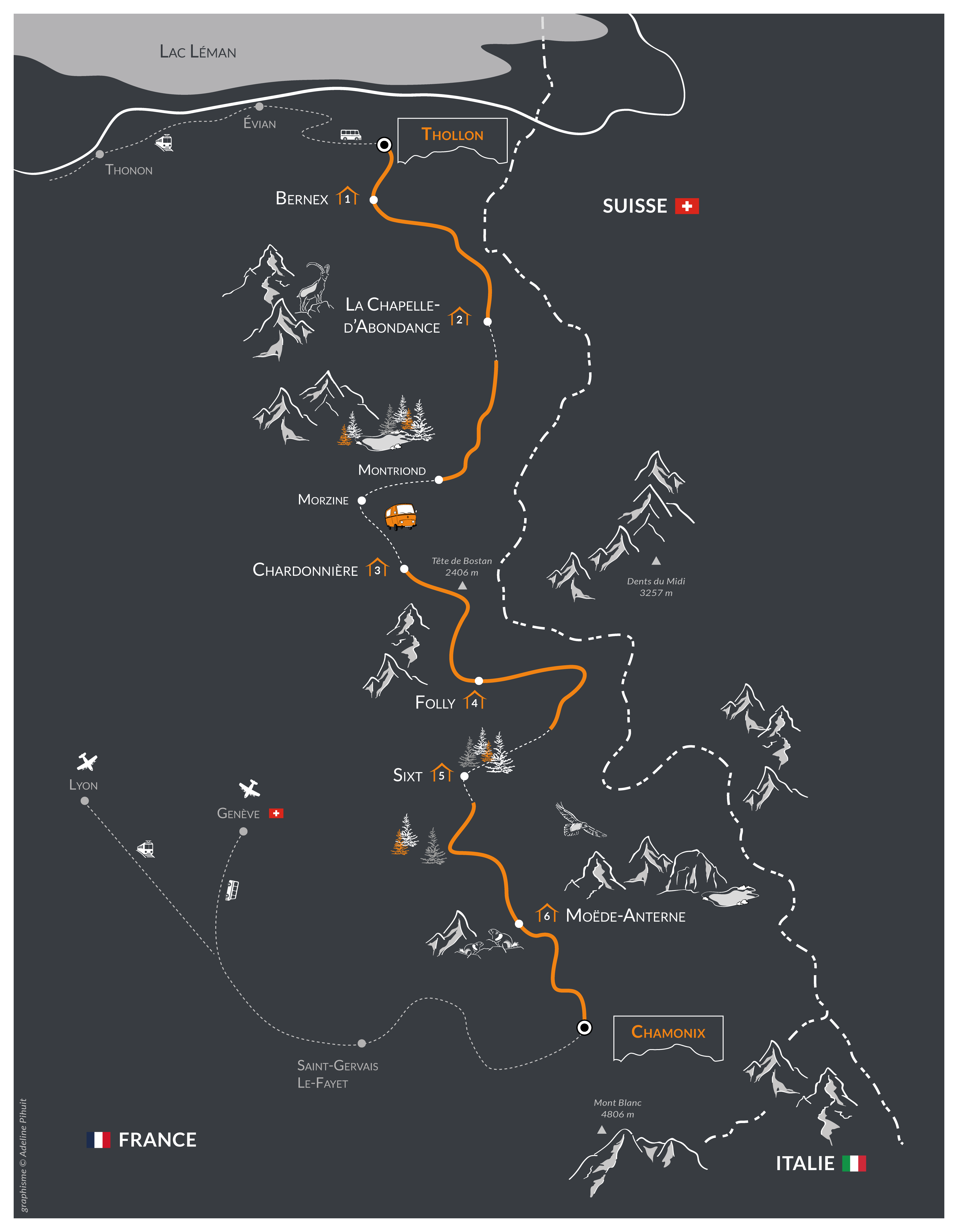 - La montée en télécabine à Thollon les Mémises le jour 1 et la descente en télécabine à Chamonix le jour 7;