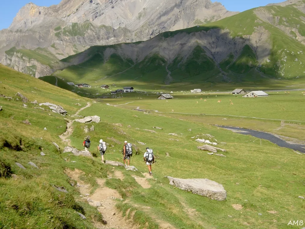 Depuis le refuge, montée au col de Schwarzgratli pour rejoindre le Wyssie Flue (2471m) et suivre la crête qui sépare les deux vallées sauvage de la Gastertal et de la Spittelmatte. Un petit aller-retour au sommet du Gällihore (2283m) pour profiter du splendide panorama et s'ensuit alors une longue descente entre vaste alpage, forêt sauvage et clairière buccolique ! Possibilité de raccourcir l'étape avec le bus depuis Waldhus.