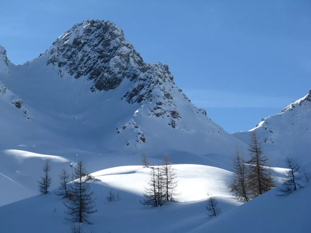 Descente rapide jusqu'au Pont du Moulin, puis par une forêt de mélèzes centenaires, vous rejoindrez la Croix de Curlet qui domine fièrement cette vaste vallée et le village de Saint-Véran. Descente "tout droit" dans la poudreuse jusqu'au Pont du Moulin puis à la Chalp.