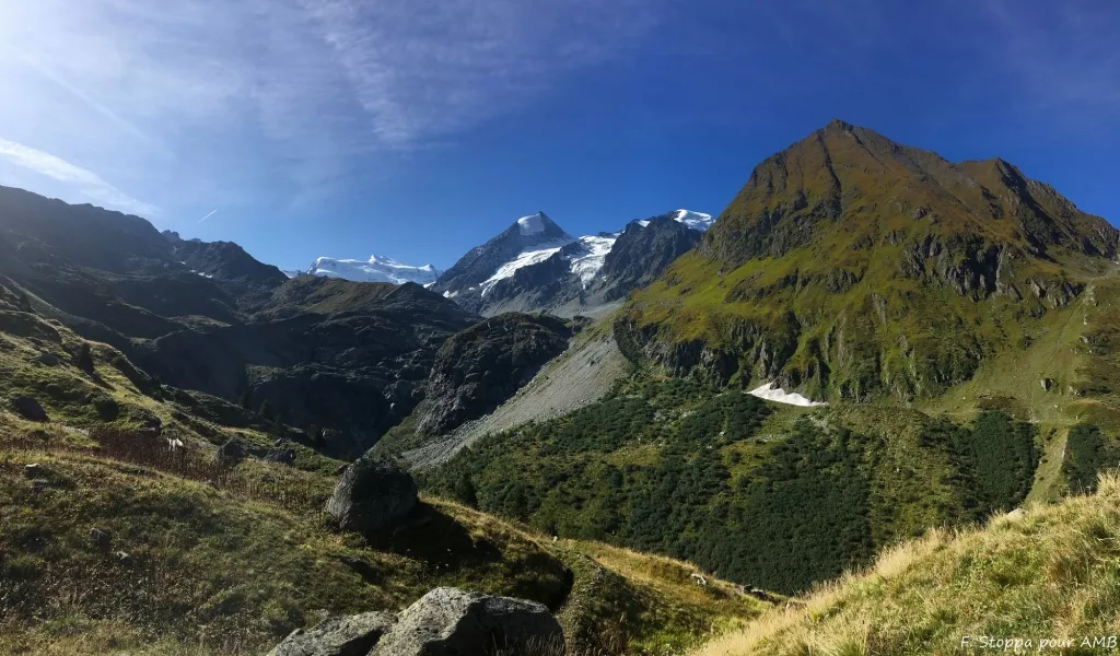 L'occasion de parcourir ces terres de contrastes, des alpages verdoyants du Val d'Ollomont aux pentes gelées du glacier de Corbassière, en passant bien sûr par le mythique Col du Grand Saint-Bernard et son hospice millénaire. Une semaine en balcon, de cols en sommets et de lacs en alpages, au coeur d'une montagne brute et paisible.